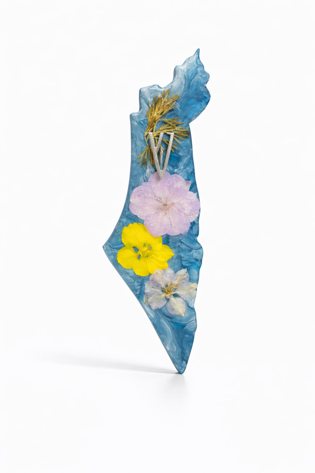 This stunning handcrafted Mezuzah case is designed in the unique shape of Israel, Made from high-quality resin with real dried flower