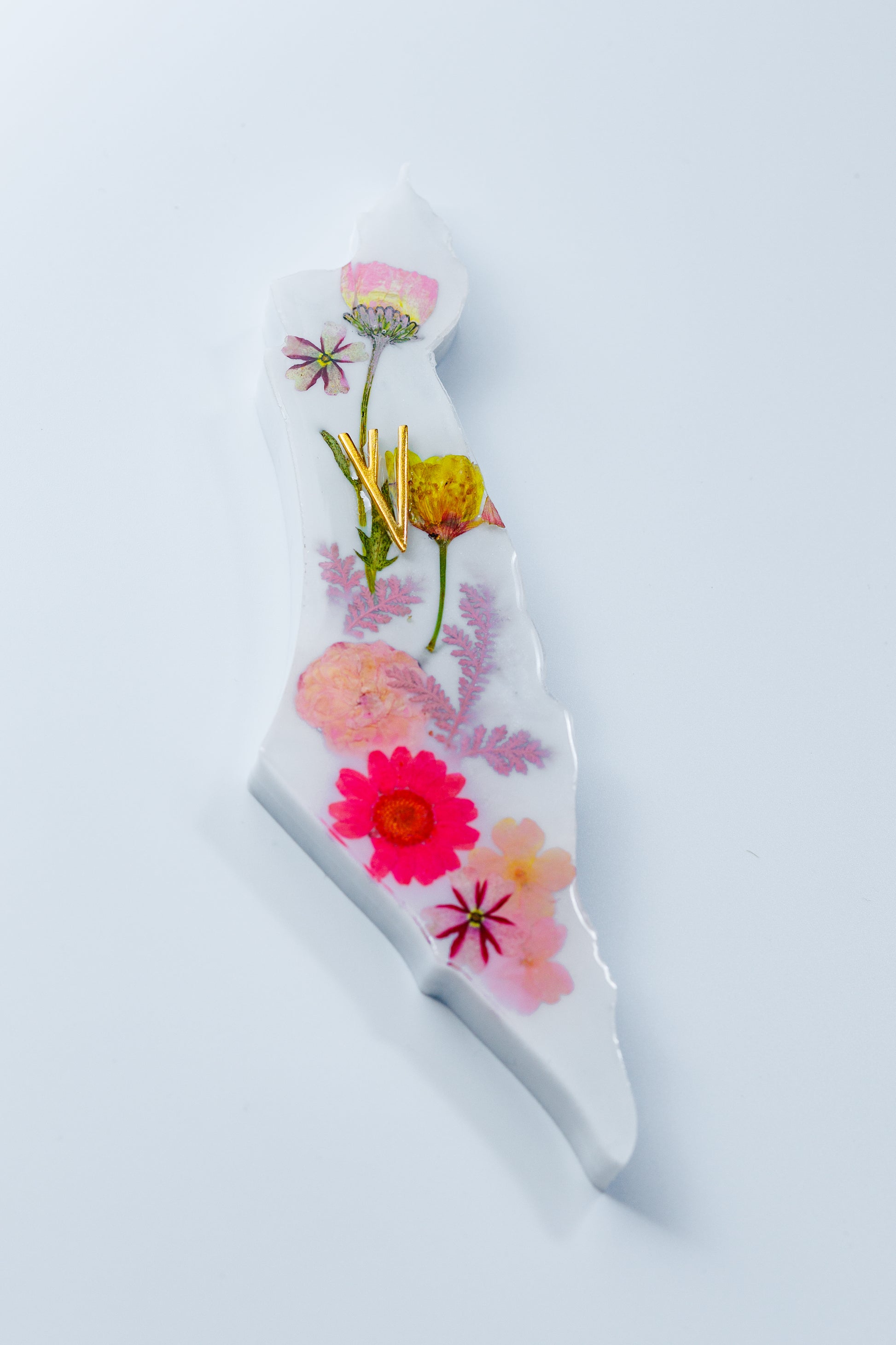 This stunning handcrafted Mezuzah case is designed in the unique shape of Israel, Made from high-quality resin with real dried flowers, this piece combines elegance, tradition, and meaning.