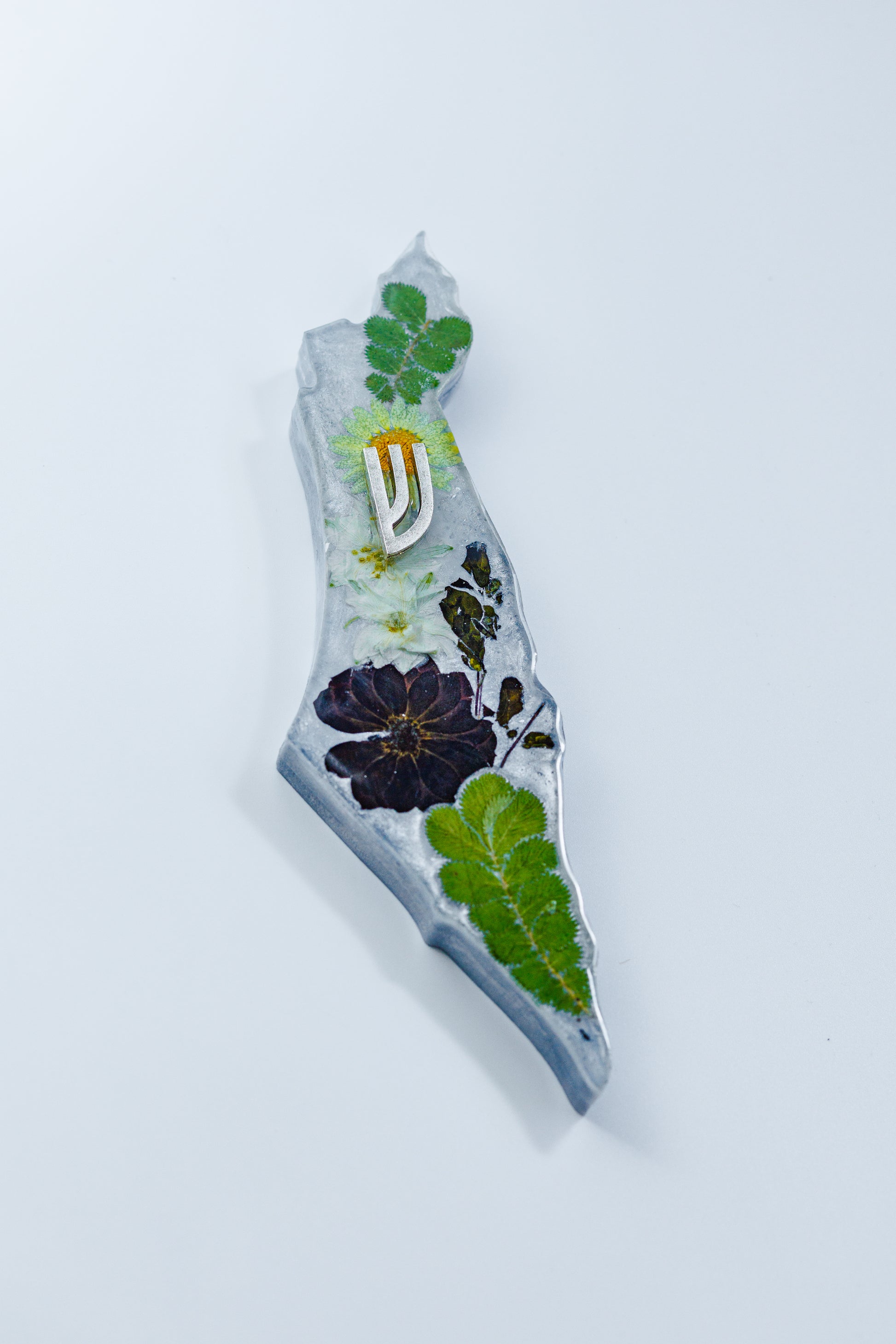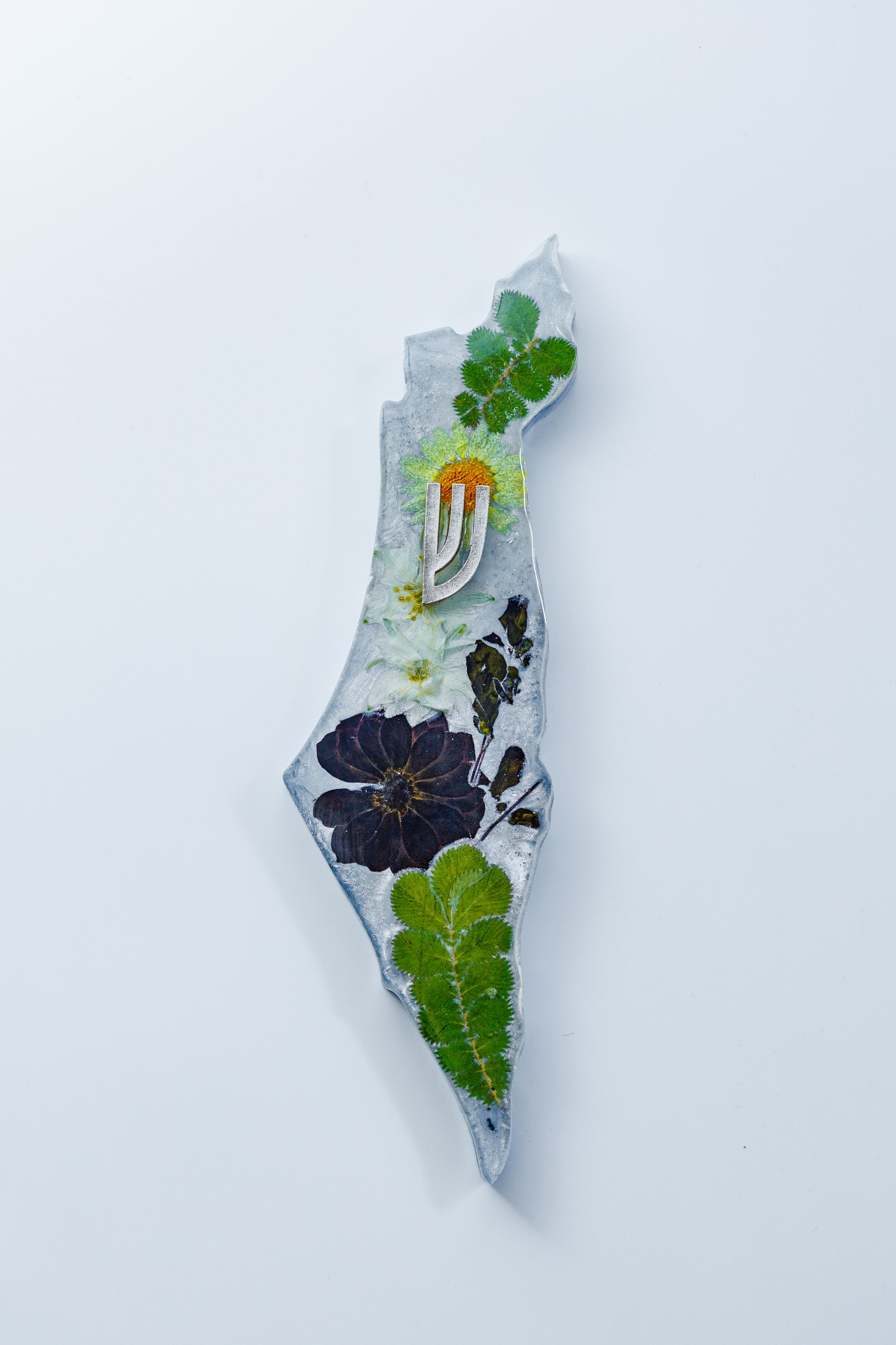This stunning handcrafted Mezuzah case is designed in the unique shape of Israel, Made from high-quality resin with real dried flowers, this piece combines elegance, tradition, and meaning.