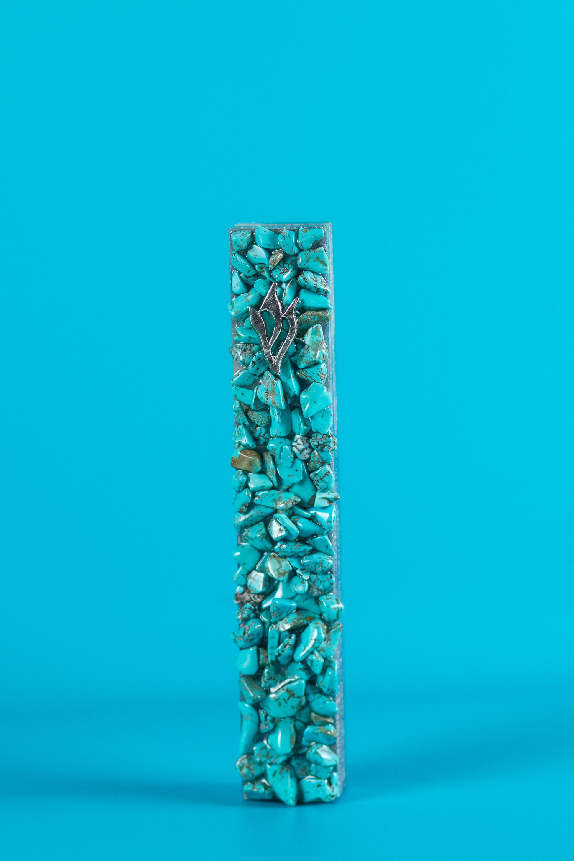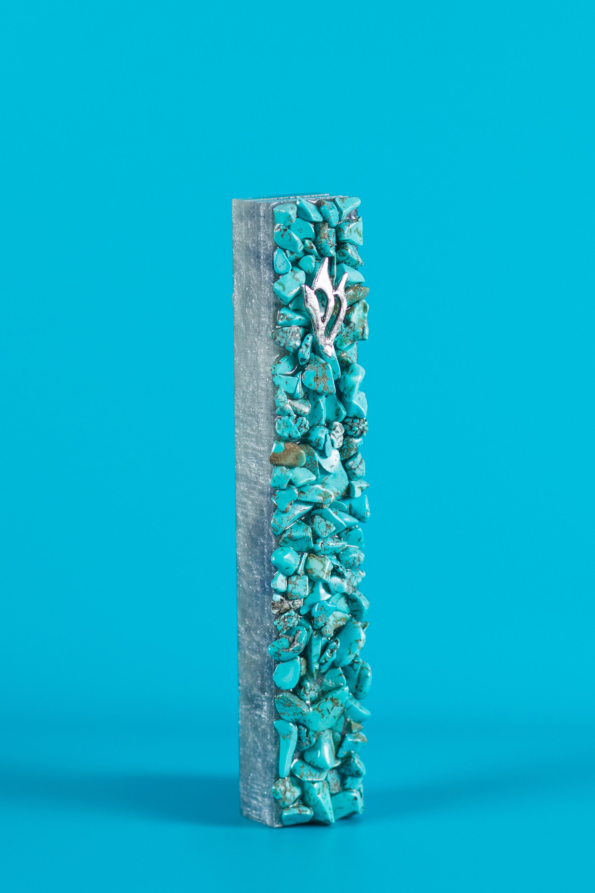 This handmade mezuzah features a gorgeous arrangement of turquoise stones set against a silver casing that highlights their natural beauty and creates an eye catching contrast. Its intricate design blends modern artistry with tradition, making it a perfect addition to any home.